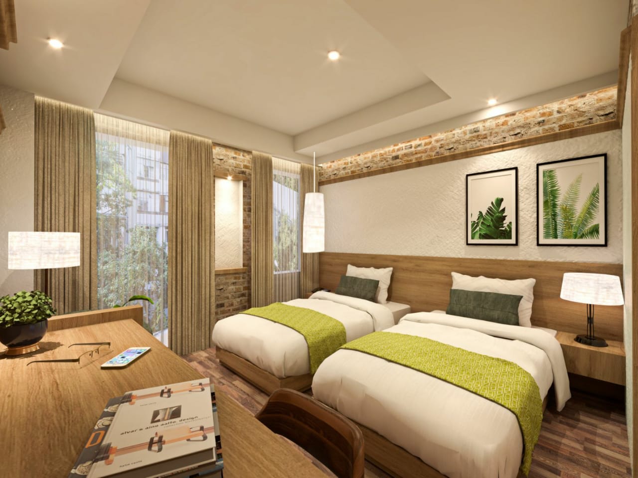 Our deluxe twin room has connected services with Luxurious bed with  Modern matters, Air-conditioner, attached bathroom, 24 hour hot water shower, Free Wi-Fi, Private Balcony.
